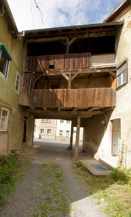 Torgasse 1a wird beschrieben als: Wohnhaus, dreigeschossiger, verputzter Satteldachbau mit Fachwerkobergeschossen über massivem Erdgeschoss, 2. Hälfte 18. Jh./19. Jh.,